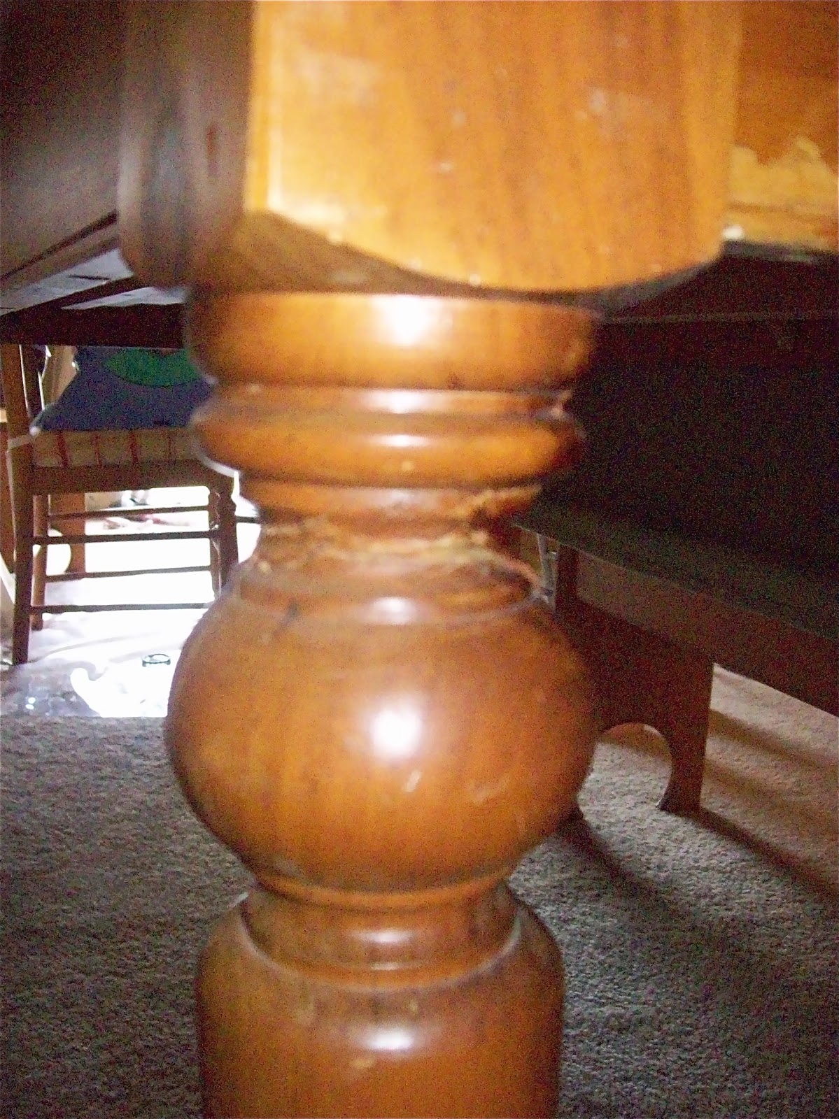 Epilogue o' the leg: It's still broken. The price to replace all 4 legs (since it would be even more to have just 1 custom-made leg) would be about $200. So, we decided to deal with it as-is until it breaks & then decide then what to do at that point (like pray to find a cheap table that has legs that would fit...or maybe I just need to learn how to turn legs myself, yeah...).